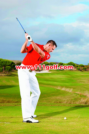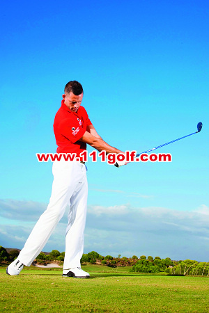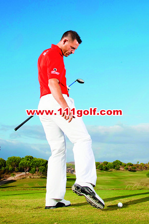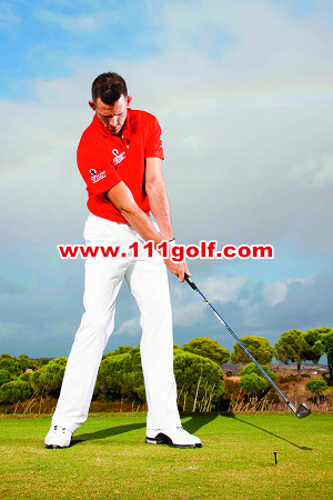 | 通过触球时如果双臂良好地往前伸展,代表你以正确的角度触球,而且能做出漂亮的送杆释放动作。如下图,我的右手臂和球杆连成一直线。要练习这个动作,你可以把球梯插在左脚外侧,试着挥杆让杆头打中它。 | 想要乾净俐落地打好噼起球,你必须在球的前方打出草痕。这裡有一个练习的好方法,将一支球梯插在球后方约一英吋处,然后试着在不碰触球梯的情况下将球击出。 |