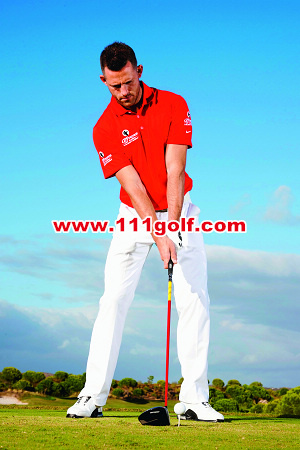 | 将球梯比平常稍微架高一些,这能帮助你将球打得更高。当你瞄球准备时,至少让半颗球高出开球木杆的上盖。 | 将嵴椎往目标反方向倾斜,这能让触球角度变得较浅平,进而提升出球角度。通过触球时,感觉身体重量并没有完全转移到左脚,而是较为居中一些,这能让你增加出球角度,将球打高。 |