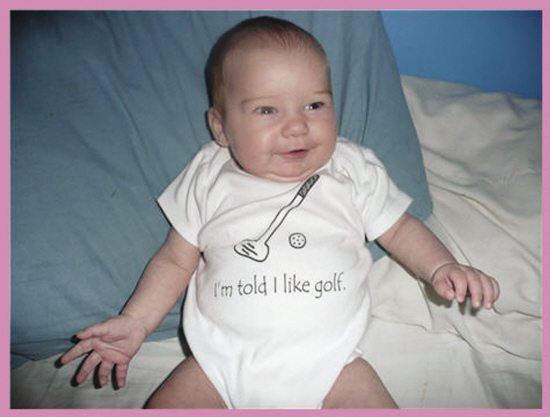 想要让孩子从小对高尔夫感兴趣,除了当父母亲的要经常言传身教以外,还有一招叫“潜移默化”:让高尔夫的观念从生活的各个方面向孩子渗透,把父母美好的愿望转变成孩子自己的理想。美国的儿童服装品牌“my lullabug”就推出了一系列高尔夫婴儿服饰,特别之处在于这些婴儿T恤和爬行服上印有的标语,不仅满载着爸爸妈妈的期望,也相当诙谐搞笑。