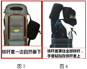 二、球包包口配有铁杆套,开球前,将铁杆套的绳子放松,同时取下其中一边的插扣,这样铁杆就可以取用了,铁杆套利用另一边的插扣自然垂下便可。(见图3) 三、打完球后将铁杆全部集中放好后,用铁杆套将铁杆全部罩住,收紧铁杆套的绳子固定于两边插扣,这样铁杆在运输途中防止窜动撞击。还可将客人的手套粘在铁杆套上自然风干(防止霉臭)(见图4)。 | ![]() |